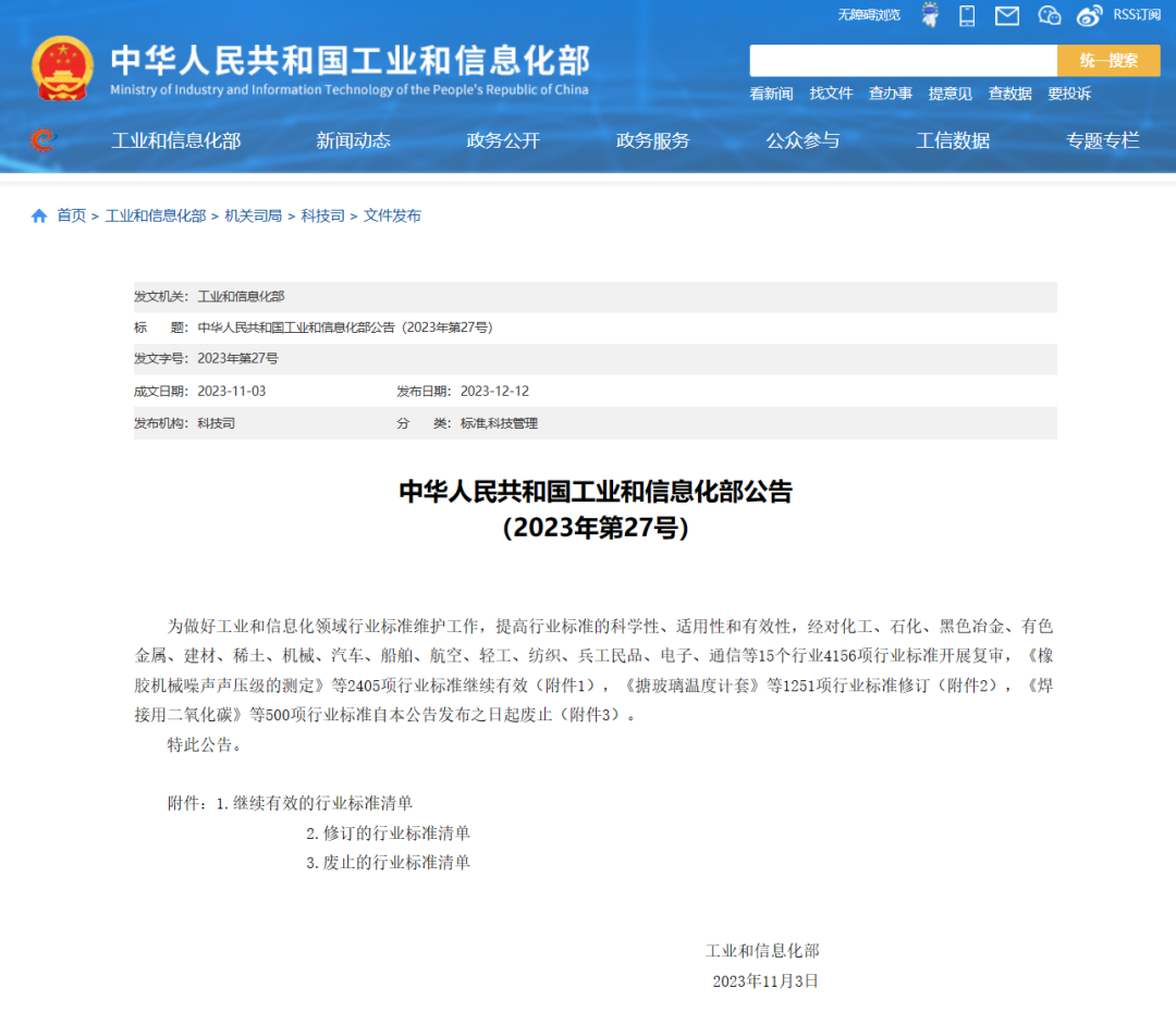 为做好工业和信息化领域行业标准维护工作,提高行业标准的科学性、适用性和有效性,12月12日,工信部发布2023年第27号公告废止500项行业标准,其中包括JC/T 333-2006《水泥工业用回转窑》JC/T 661-1997《建材机械产品分类及型号编制方法》2项建材机械行业标准。