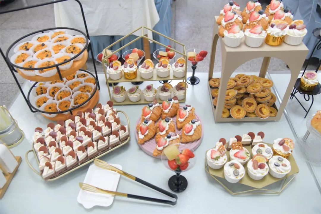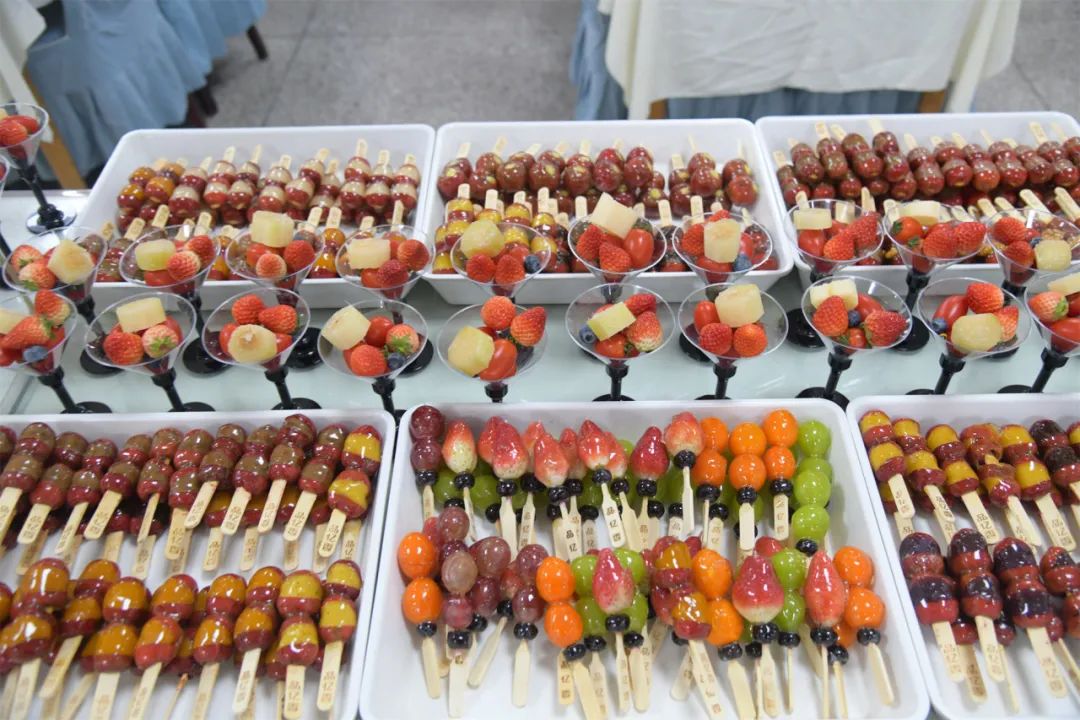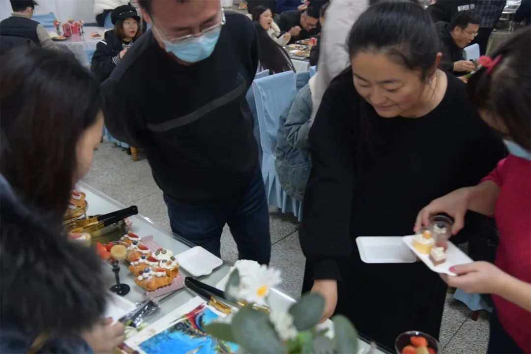 美食节现场,陕西小吃凉皮、肉夹馍、羊血饸络翩然出席,硬菜土豆炖牛腩、小炒肉、糖醋鸡米花喷香扑鼻,还有新鲜大只的白灼大虾、健康时蔬、巧手制作的枣馍、银耳雪梨小芋圆等等齐聚一堂。甜品区,各种小甜点、水果杯簇拥着印有公司照片的大蛋糕以全场最佳全面俘获了诸位吃客的心和胃。