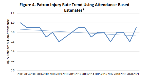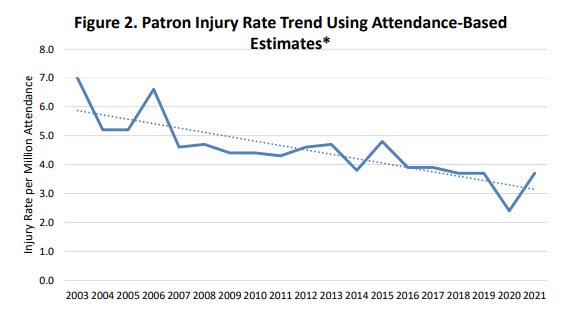 从2003年到2021年,每百万人次的受伤率下降了47%,从每百万人次7起降至3.7起。