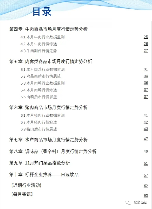 由网聚资本、红餐产业研究院出品的《食品与餐饮连锁企业采购行情月度参考(2023.12)》于近日发布。有哪些最新餐饮食材采购信息?一起来看看吧。国际动态:涉及到美国的制造业采购经理人指数(PMI)下降、欧盟与新西兰的自由贸易协定、法国土豆价格上涨、科特迪瓦可可产量下滑及价格上涨、韩国生蚝对华出口增加、美国原油库存增加和柬埔寨农产品出口情况等。国内动态:包括中国经济政策导向、某些物质纳入食品与中药材目录、食品贸易情况、对某些最不发达国家产品实施零关税、粮食产量增长、购物中心市场发展、产品碳足迹管理体系建设进展、数字化食品标签的推进和居民消费指数变化等。居民消费指数:详细介绍了2023年11月份全国居民消费价格的同比与环比变化情况,以及食品与非食品价格的具体变化。生产者物价指数:包括了工业生产者出厂价格和购进价格的同比和环比下降情况。采购经理指数:分析了制造业、非制造业及综合PMI产出指数的变化,以及各行业生产和新订单指数等。各类食品市场月度核心观点:涵盖了牛羊肉、肉鸡、肉鸭、猪肉、水产品、蔬菜、稻米、小麦、玉米、大豆、油料、食糖、咖啡豆、水果(国产与进口)等多个方面的市场价格、供需变化和预测。