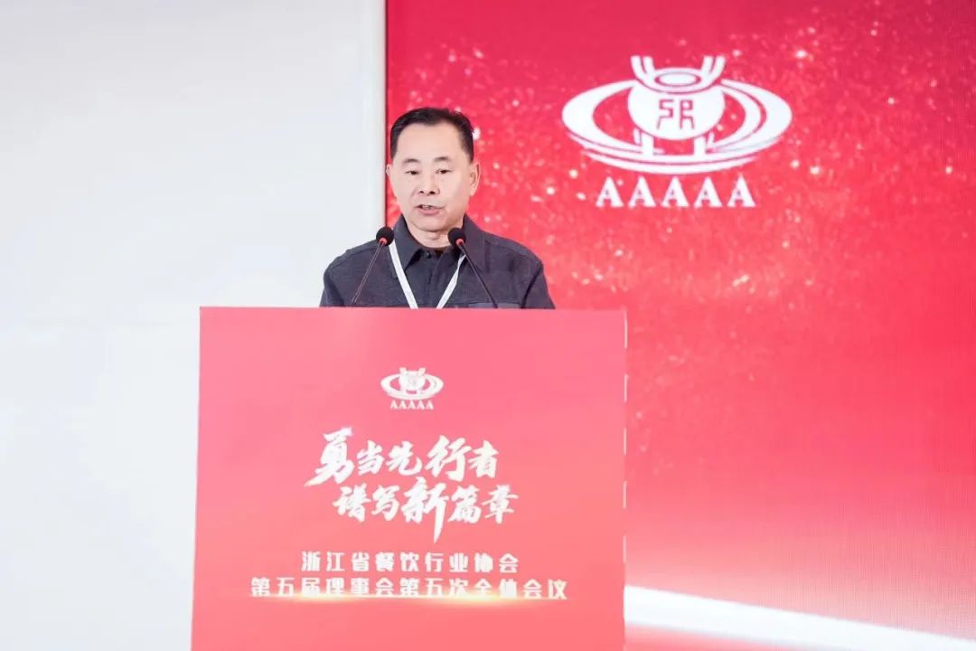 会上,首先由省餐饮行业协会会长沈坚作协会五届理事会2023年度工作报告。他指出,2023年是浙江省“八八战略”实施20周年,也是亚运盛会举办的一年,协会迎来了充满机遇的一年。纵观协会一年来的工作,他说,协会按照省委易炼红书记“餐饮为民、餐饮乐民、餐饮富民”的要求,紧紧围绕商务中心工作和协会服务宗旨,从“开展主题教育、凝聚党建合力;发挥平台作用、助推行业发展;树立餐饮品牌、推动消费升级;助力亚运添彩、共促文化互鉴”等四个方面做了详细阐述。并提出了协会2024年工作思路,协会将按照习近平总书记在浙江考察时强调“始终干在实处走在前列勇立潮头 奋力谱写中国式现代化浙江新篇章”的重要指示精神,认真贯彻落实中央和全省经济工作会议精神,按照省商务厅提出的“四个重大任务”要求,贯彻落实好省商务厅着力提振大宗消费、着力扩大商文旅融合、着力壮大新型消费、着力优化消费场景、着力营造消费氛围、着力做强促消费品牌等打好促消费重点领域“组合拳”的工作部署,进一步强化党建统领,有序开展各项促消费活动,加强技能人才培养,加大行业宣传力度,推动产业融合发展。