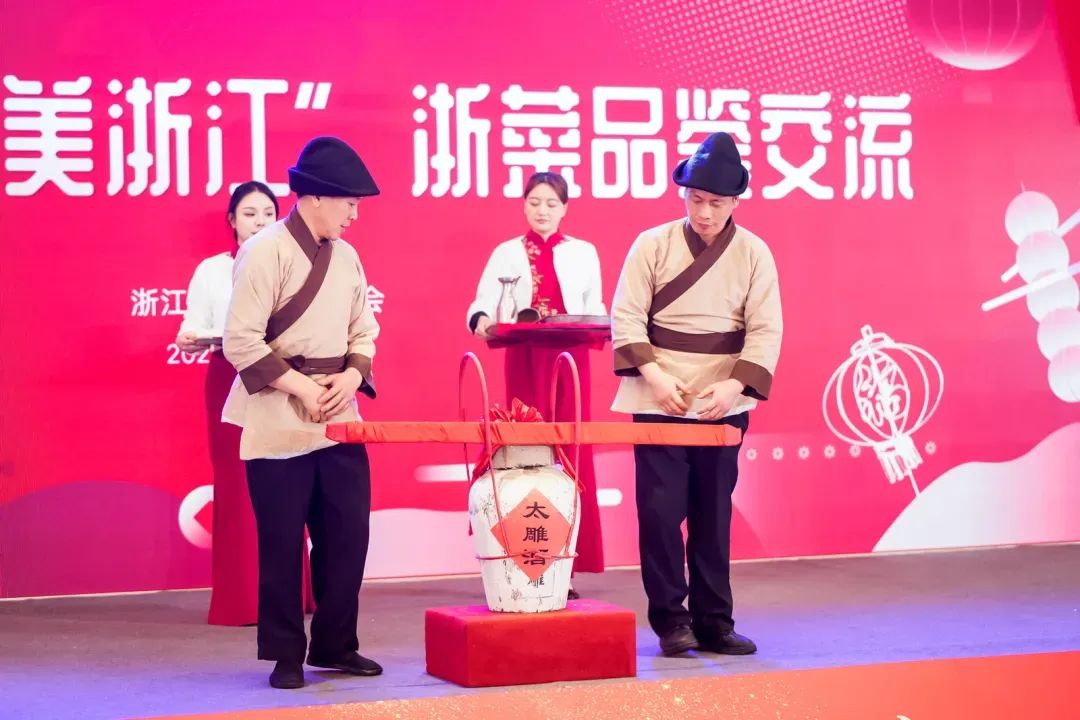 在悠扬的民歌声中,二位老师傅扛着一坛绍兴太雕美酒缓缓走到台上,由咸亨酒店带来的一场独具绍兴特色的“花雕美酒开坛仪式”,把祥和欢乐的品鉴晚会气氛推向高潮。