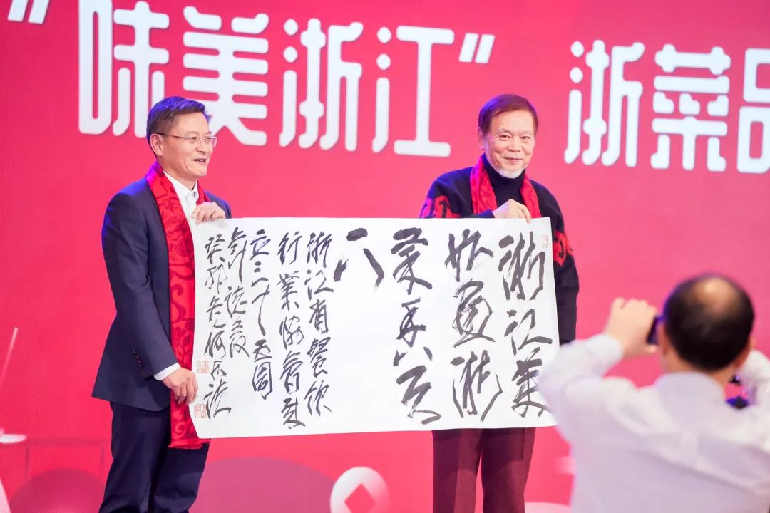 全国政协委员、浙江省政协常委、中国文化艺术发展促进会宋画艺术研究院院长何水法先生为庆贺省餐饮行业协会成立35周年赠送“浙江美如画 浙菜香天下”墨宝。