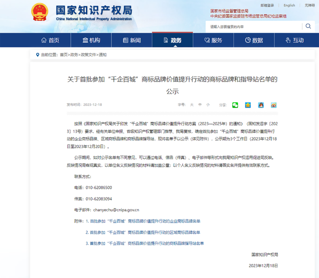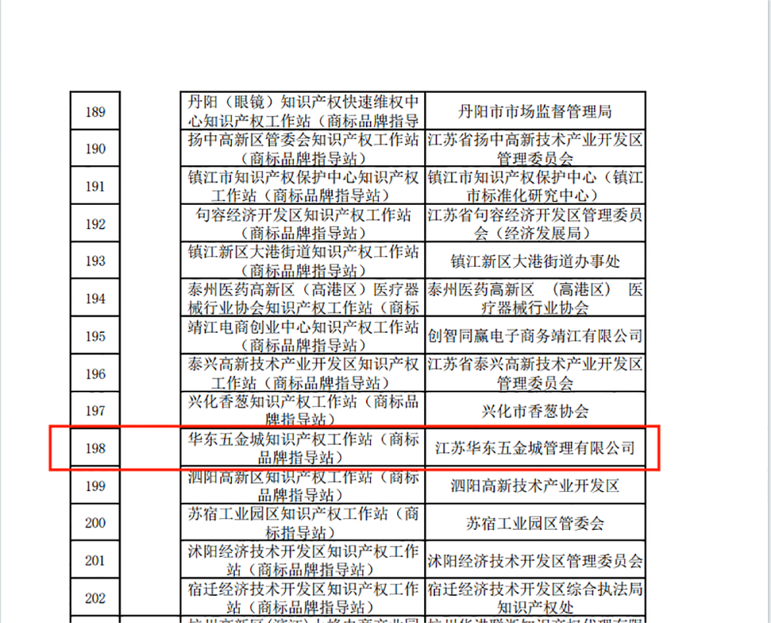 按照《国家知识产权局关于印发“千企百城”商标品牌价值提升行动方案(2023—2025年)的通知》要求,经有关单位申报、省级知识产权管理部门推荐、国家知识产权局复核。12月18日,国家知识产权局公布了首批“千企百城”商标品牌价值提升行动名单,区工商联副主席企业江苏华东五金城管理有限公司成功入选商标品牌指导站名单。
