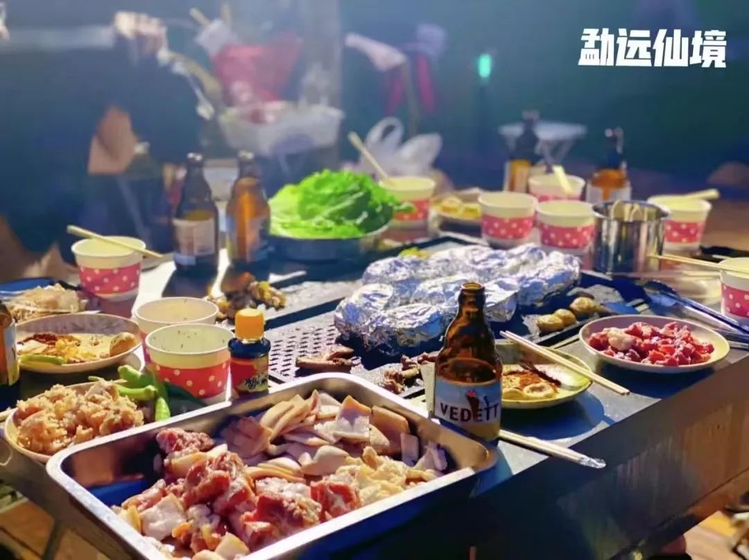 晚间时刻大家围坐在烧烤桌旁,享受着烧烤的香气大家一起动手烤制一顿独具傣族特色的美食。
