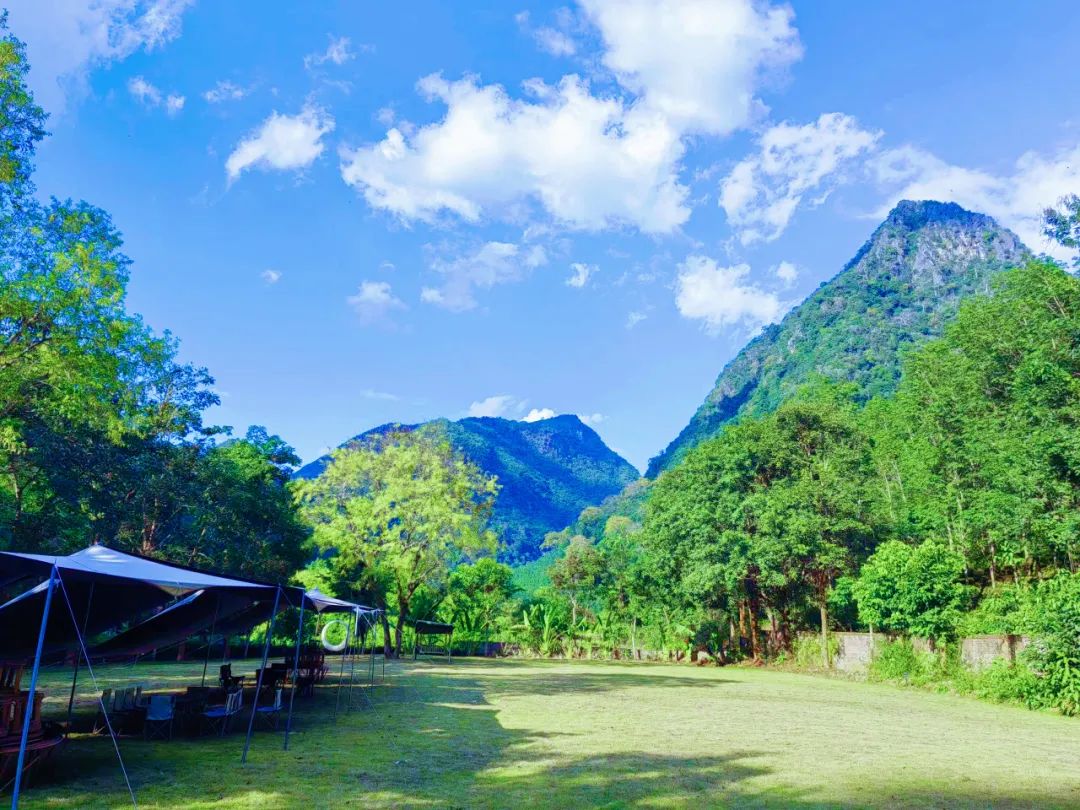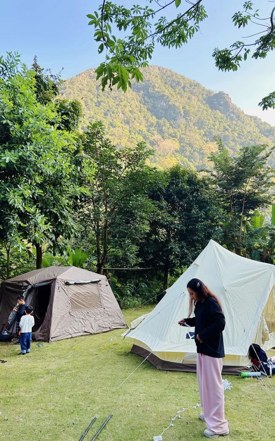 下午,大家在穿越结束之后到勐远仙境露绿草如茵的营地上搭起了精致的露营帐篷。