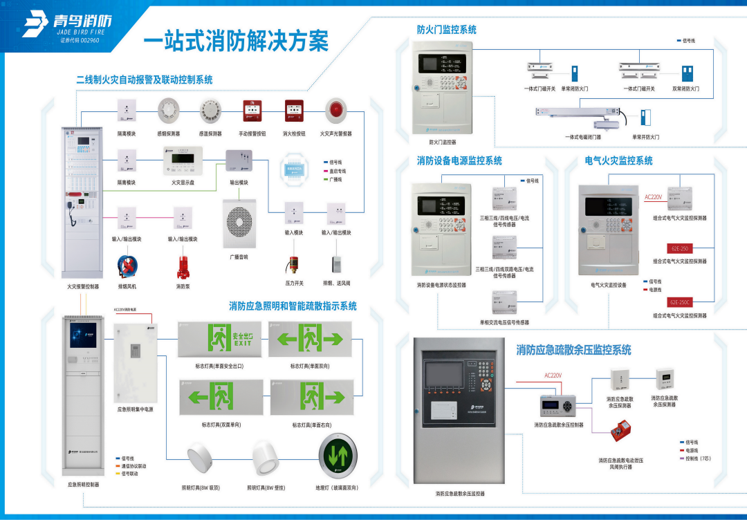 公司主营:火灾自动报警及联动控制系统、电气火灾监控系统、消防设备电源监控系统、七氟丙烷气体灭火系统、防火门监控系统、消防应急照明及疏散指示系统、工业及民用可燃/有毒气体探测系统、城市消防远程监控云系统等产品。