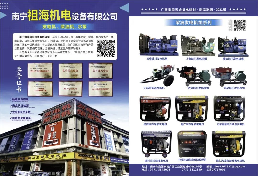 公司主营:玉柴、潍柴、上柴、科普、嘉陵、常动等名优品牌柴(汽)油发电机组、柴油机、汽油机、柴(汽)油机水泵、水管、水带、柴(汽)油机配件、发电机配件、出租、维修保养等业务。销售网络遍布广西各市、县及东南亚国家。