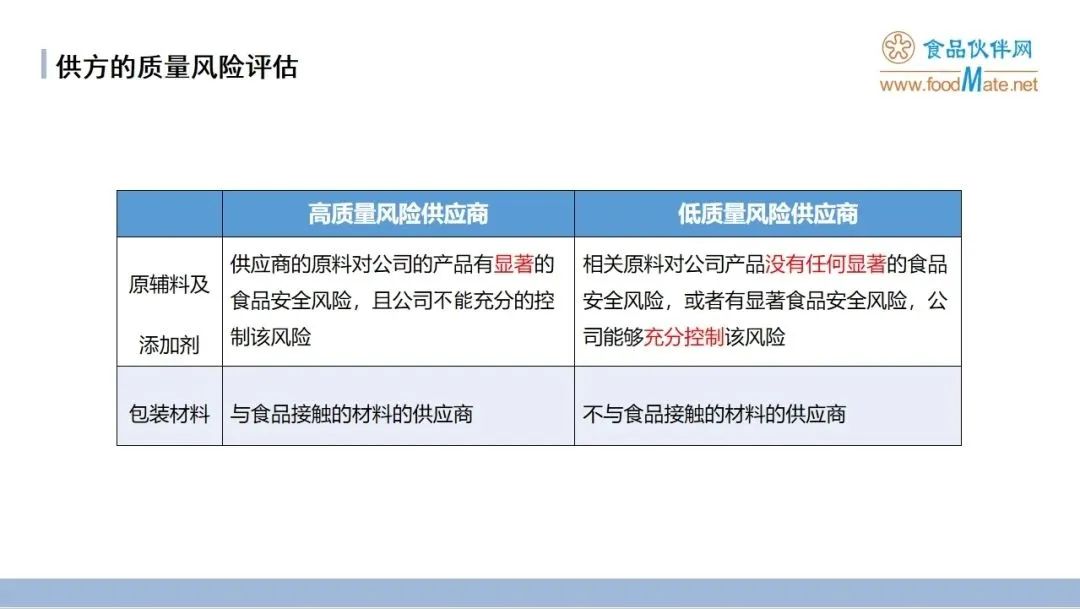 设定质量评判要素,群策群力综合采购、质量、技术、生产、仓储等各部门对物料进行打分,得分高者为高质量风险供应商,比如:一种原物料虽然使用量很少,但是对成品影响程度很大,可判定为高质量风险物料。