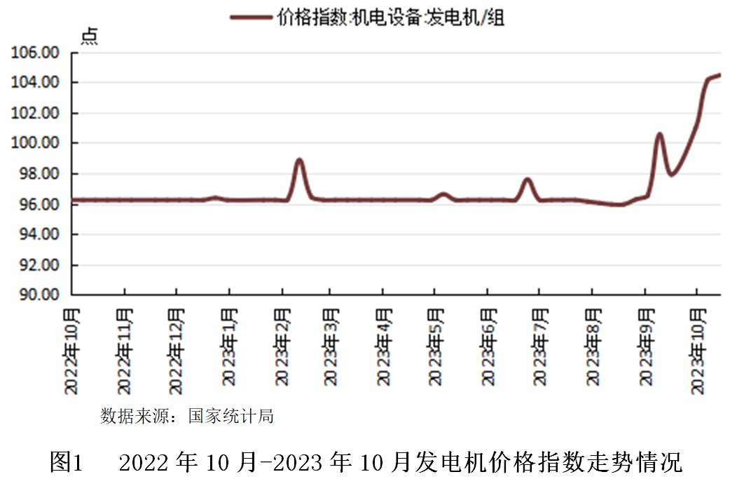 进入2023年,我国发电机组短期经过上涨快速回落后,继续保持平稳运行态势,10月价格实现大幅上涨。据工商业联合会数据,截至2023年10月27日,我国发电机组价格指数为104.45点,较2022年同期提高8.21点。