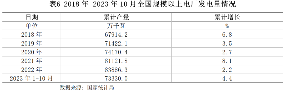 2023年以来,各行业快速恢复,我国全社会发电量保持平稳增长。1-10月份,发电量73330.0亿千瓦时,同比增长4.4%,增速较2022年同期提高2.2个百分点。