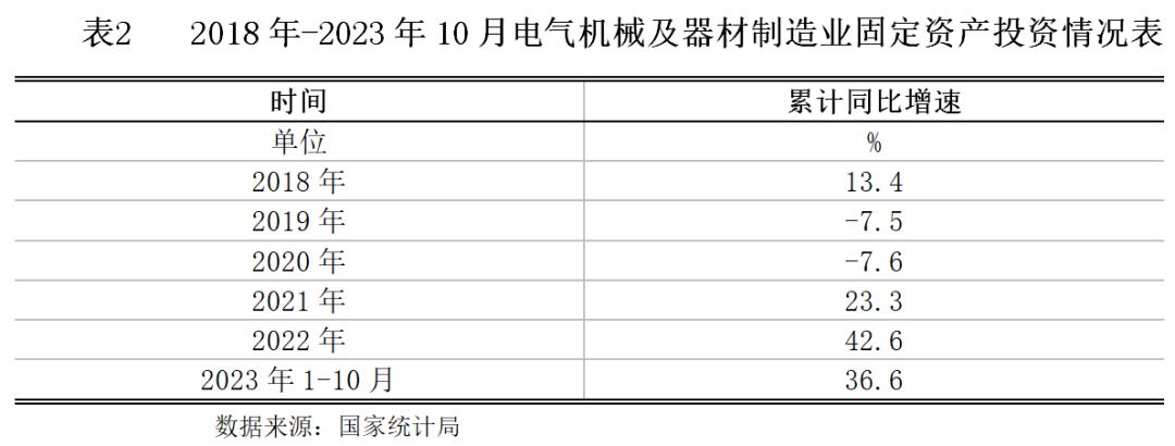进入2023年,我国政府继续出台政策措施大力保障我国电力能源安全可靠供应,我国电气机械及器材制造业固定资产投资继续保持总体增长趋势。据国家统计局数据,2023年1-10月份,我国电气机械及器材制造业固定资产投资累计同比增长36.6%,增速相比2022年同期回落3.1个百分点。