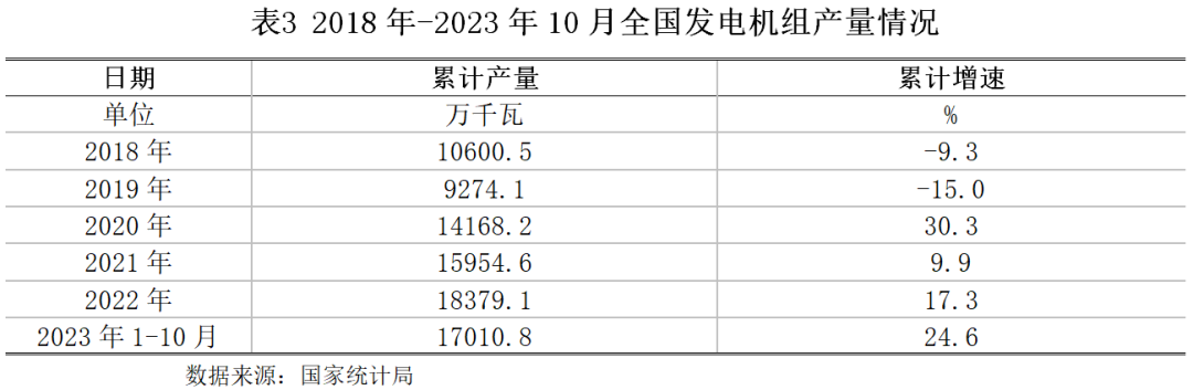 近年来,随着我国电力事业的巨大进步,我国电力装备行业也呈现出较快的发展速度,发电机组及交流电动机产量呈稳定增长趋势,与此同时,随着我国城市化的发展和建设速度不断加快,我国电力装备行业也迎来了黄金发展期,发电机组和交流电动机在产能、产量、容量等各个性能方面都有了长足发展及进步。2023年以来,电力系统安全稳定运行,电力供需总体平衡,全国基建新增发电装机容量同比增加,其中新能源增加超过70%;电力完成投资较快增长。1-10月份,我国发电设备累计产量为17010.8万千瓦,累计同比增长24.6%,增速较2022年同期扩大10.3个百分点。