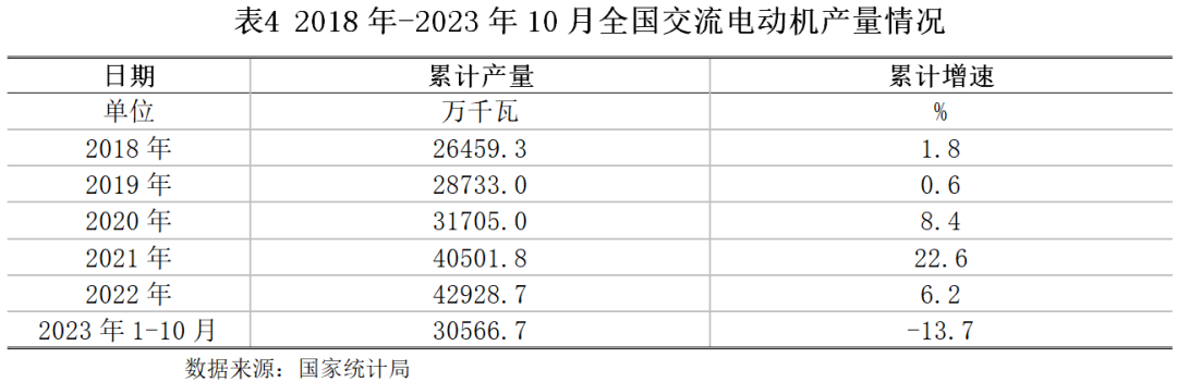 2023年1-10月份,我国交流电动机累计产量为30566.7万千瓦,累计同比下降13.7%,降幅相比2022年同期扩大22.1个百分点。