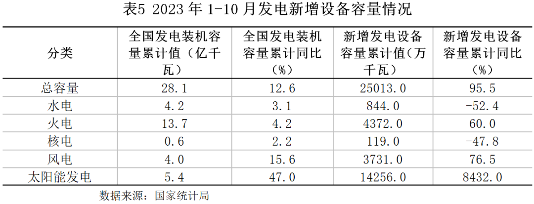 截至2023年10月底,全国累计发电装机容量约28.1亿千瓦,同比增长12.6%。其中,太阳能发电装机容量约5.2亿千瓦,同比增长47.0%;风电装机容量约4.0亿千瓦,同比增长15.6%。