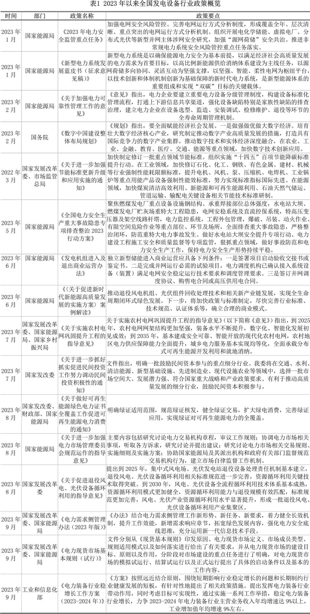2023年以来,国家政策围绕稳增长促发展,促进长效发展,支持新型电力系统建设,加强电力可靠性管理等方面展开。1月,国家能源局发布《新型电力系统发展蓝皮书(征求意见稿)》,强调加快规划建设新型能源体系,构建新能源多元化开发利用新格局;6月,国家能源局表示将确立退役风电光伏回收处理商业模式,推动退役风电机组、光伏组件回收处理技术和相关新产业链发展,实现全生命周期闭环式绿色发展。重视对发电设备行业的技术投入,对企业技术水平、电力设备要求更加严格;9月,国家发展改革委等部门印发《电力需求侧管理办法(2023年版)》,推动配电网增容、线路改造和智能化升级,提升配电网规模化接入分布式电源、柔性负荷的能力;工业和信息化部发布《电力装备行业稳增长工作方案(2023-2024年)》,提出力争2023-2024年电力装备行业主营业务收入年均增速达9%以上,工业增加值年均增速9%左右,推动我国电力装备行业高质量发展。
