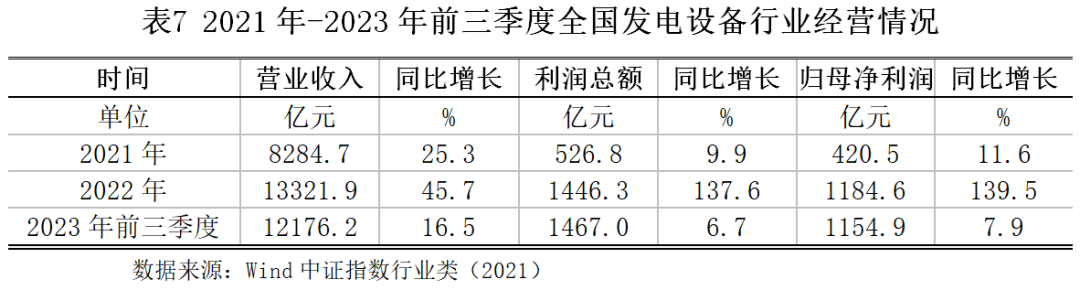 2023年以来,我国政府加大力度促进我国新型电力系统建设,出台多项政策措施,保障电力能源安全可靠供应,我国电气机械及器材制造业行业规模始终保持较快扩张的态势。2023年前三季度,我国发电设备行业营业收入累计为12176.2亿元,同比增长16.5%;同期,我国发电设备行业利润总额为1467.0亿元,同比增长6.7%;归母净利润为1154.9亿元,同比增长7.9%。
