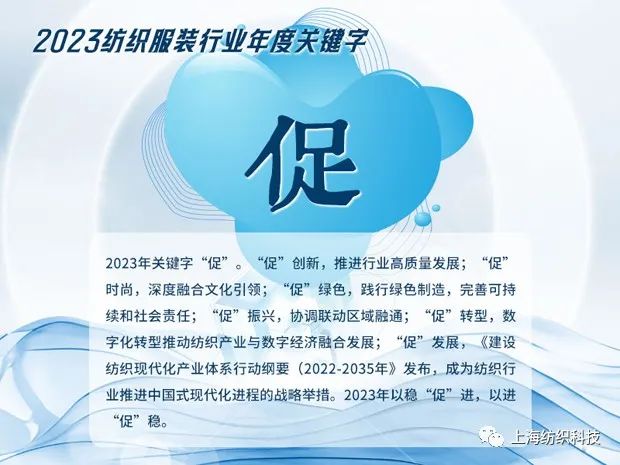 2023年关键字“促”。“促”创新,推进行业高质量发展;“促”时尚,深度融合文化引领;“促”绿色,践行绿色制造,完善可持续和社会责任;“促”振兴,协调联动区域融通;“促”转型,数字化转型推动纺织产业与数字经济融合发展;“促”发展,《建设纺织现代化产业体系行动纲要 (2022-2035年》发布,成为纺织行业推进中国式现代化进程的战略举措。2023年以稳“促”进,以进“促”稳。