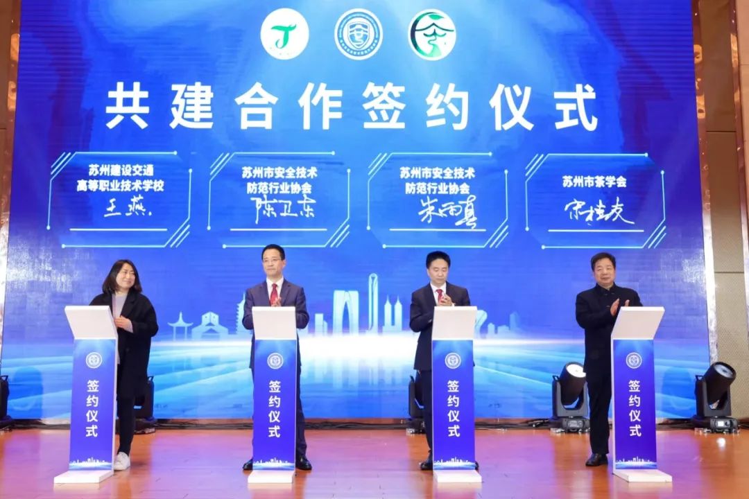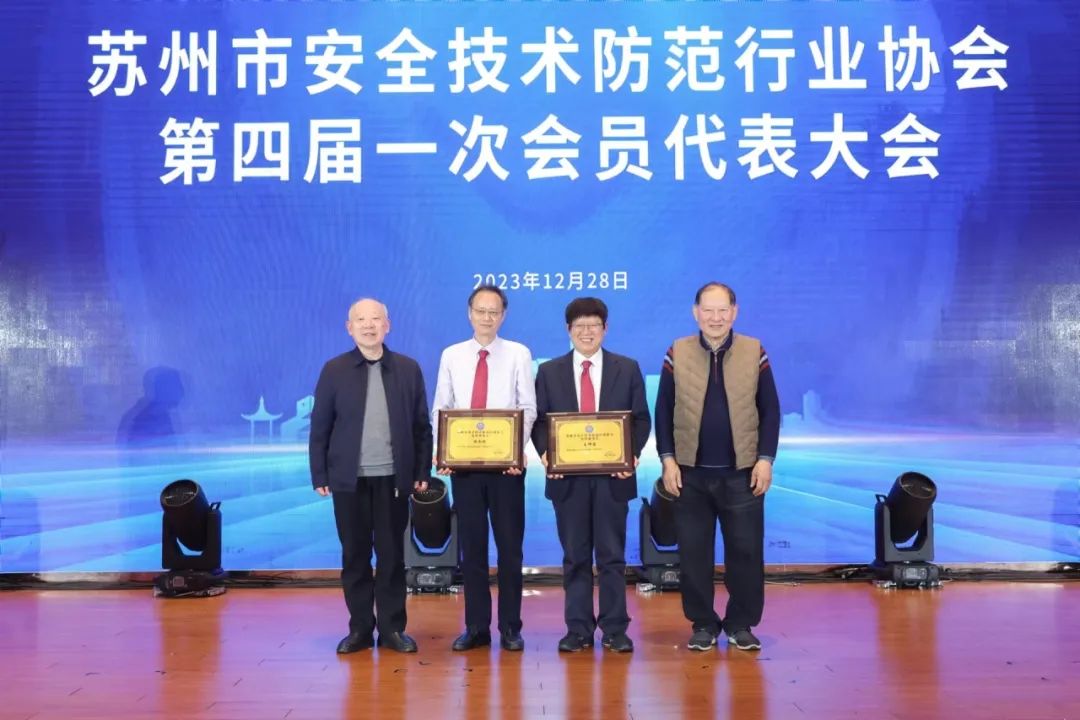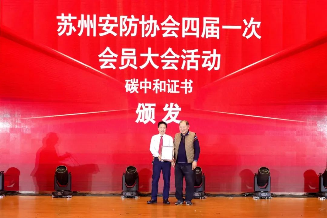 此外,大会还进行了苏州市安防协会太仓分会成立仪式,与苏州建设交通高等职业技术学校建立校企合作、与苏州市茶学会结为友好协会进行共建合作签约仪式,并为新任副理事长和理事单位授牌,还分别为优秀党建工作企业、星级诚信企业、优秀技防团标专家、优秀编辑、特聘专家、新增消防分会专家、2023 年度优秀产品供应商、2023 年度捐助荣誉单位颁发证书等内容。原苏州市委副书记、人大常委会主任黄俊度向苏州安防颁发《大会碳中和证书》。