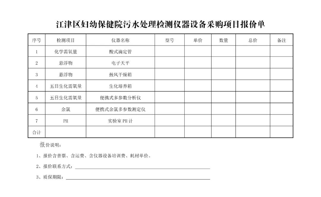 重庆市江津区妇幼保健院因工作需要,现对我院污水处理检测仪器设备采购项目发布市场调研公告,欢迎符合资质的供应商参与报价。