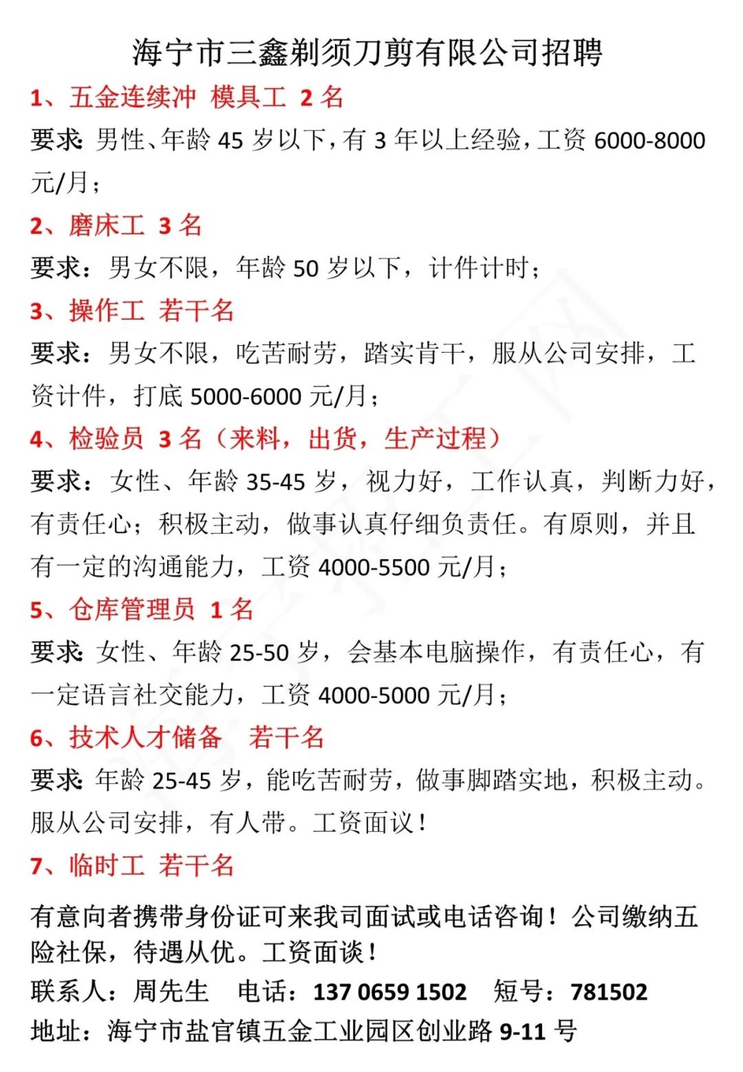 【三鑫剃须刀剪】招五金连续冲 模具工、磨床工、操作工等岗位