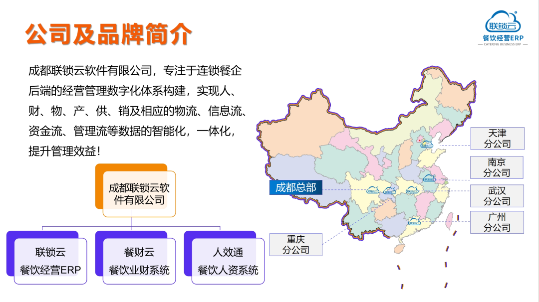 联锁云陆续在广州、武汉、天津、南京等地设立分公司。提供免费上门咨询服务,免费提供覆盖10大餐企细分领域的解决方案。