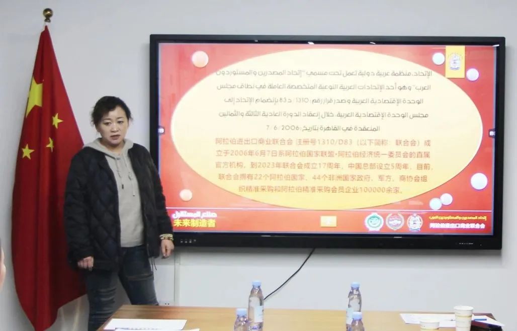 阿拉伯进出口商业联合会执行秘书长李迎琳从“电子商务、批发业务、金融服务、国际经济信息等方面介绍了阿拉伯进出口商业联合会各项工作与职能。执行会长尤楷嘉则从时间、企业审核、采购内容、采购支付、合作方式等方面,向大家详细介绍了拟于2024年1月20日,在西安港务国际采购中心举办的“阿盟采购团走进“西安”,采购精准对接会”政策规则。