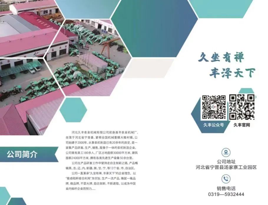 河北久丰农业机械有限公司是一家长期致力于研发、制造、销售、服务为一体的现代农机装备制造企业。公司生产的秸秆饲料打捆机系列产品,产品畅销黑龙江、吉林、辽宁、内蒙、河北、山西、山东、陕西、甘肃、宁夏、新疆等全国10多个省、市、自治区。得到了用户的一致肯定,其市场占有率、企业效益居同行业前列。公司在长期的生产经营活动中始终以“用户至上,创名牌产品”为经营理念。以“求实、创新、奉献、兴农”为企业精神,形成了“技术、管理和市场”三大核心竞争力。秸秆还田机、旋耕机从0.9m-5.0m,配套拖拉机动力从20马力到300马力,应有尽有,可以满足用户的不同需求。1JQH系列秸秆切碎还田机已累计产销十余万台,刀具形式有锤爪、弯刀和直刀等多种多样,以其过硬的质量,可靠的性能,良好的售后深受广大农民朋友的喜爱。选择久丰农机,带来丰收富裕。