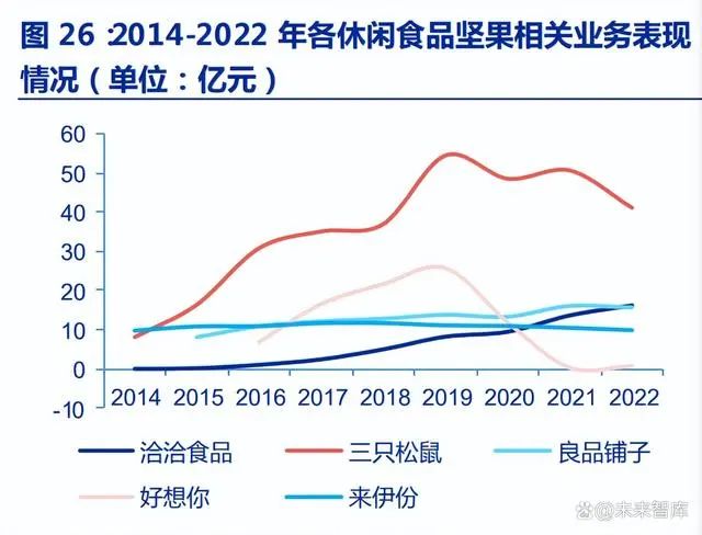 电商渠道的兴起伴随着若干细分品类的成长。虽然前期对于旧有渠道的相同品类造成 一定挤压,但随着消费者认知的加深,整体行业空间仍持续扩大。洽洽的坚果业务早期以 开心果、核桃、杏仁等传统坚果炒货产品为主,三只松鼠抓住消费趋势变化,推出腰果、 夏威夷果等品类,2014 年以前确实对洽洽的坚果销售带来一定影响,但后续各企业均布局 类似产品,包括沃隆 2015 年推出每日坚果大单品,带动混合坚果行业快速发展,大部分企 业 2022 年坚果业务营收相比于 2015 年仍是翻倍以上增长。