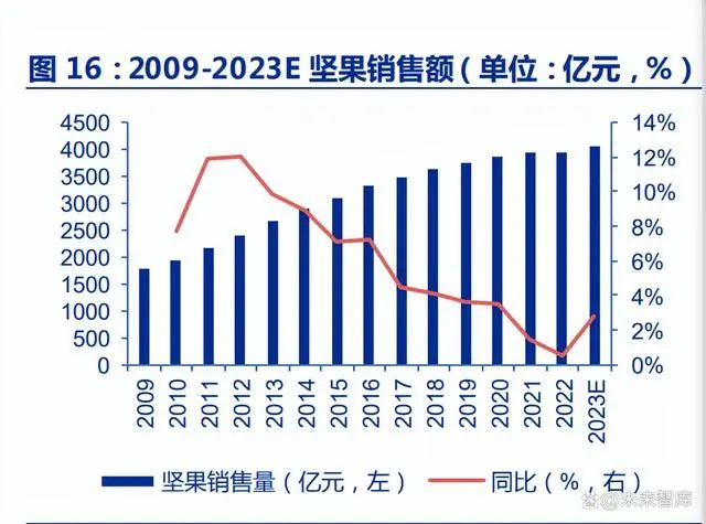 我们认为电商渠道的兴起给休闲食品行业带来了三点明显的变化:1)休闲食品行业规 模加速增长,电商渠道利用互联网技术和便捷的快递服务优化消费者的体验,更好的满足 个性化的需求,市场往更细分的方向拓展,行业规模持续扩大;2)部分企业借东风之势, 完成弯道超车,休闲食品企业若想依靠线下渠道实现跨区域经营,需要大量资金投入去建 设完善的销售网络与高效的渠道管理机制,而电商渠道帮助企业突破地域性的限制,部分 企业借助电商渠道加快实现全国化布局,完成弯道超车;3)刺激供应链向需求导向的个性 化和定制化方向重构,电商渠道的兴起帮助帮助下游需求更容易向上游传递,休闲食品公 司利用自身在终端掌握的大数据资源,可以提供给供应商更精准的需求信息,供应链由原 先的产品推动型向需求拉动型转变。 坚果炒货作为我国传统零食,行业参与者众多,由于具有方便物流配送、易分享和快 速扩散等良好的互联网基因,当电商风口来临时,消费者对产品的关注度持续提升,市场 规模持续扩大。根据欧睿统计,预计 2023 年坚果行业市场规模达到 4063 亿,同比增长 2.8%。