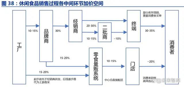休闲食品行业主要有四种经营模式:个体经营零售、超市卖场零售、连锁专卖店零售 和电子商务模式。回顾休闲食品渠道的变革,基本上可以分为五个阶段: 大流通主导,渠道结构单一(1970-1990):以国有大型百货为主体的单一业态。彼 时物资生活匮乏,休闲食品品类较少,以饼干、糖巧、罐头等产品为主,主要为满足充饥 性需求,尚无其他休闲零食。 外资商超进入中国市场,渠道逐渐多元化(1991-2000):20 世纪 80 年代中期超级 市场的零售业态引入中国,1992 年允许外资零售企业进入中国零售领域,我国形成百货、 超市、便利店等多种业态并存的格局。统一、旺旺等台资企业在 90 年代进入中国大陆市场 后,专注于少数的 SKU 的宣传营销,通过流通渠道,便可快速触达全国的消费者。休闲食 品品类上,膨化食品、糖果等占主导地位,舶来品和国产零食各据半壁江山。 商超渠道兴起,电商渠道方兴未艾(2001-2011):零售业态由偏重超市业态,向便 利店、仓储商场等多种业态发展。多家休闲食品公司以连锁专卖店形式开始拓展;2003 年 淘宝成立,各类电商品牌开始崛起,电子商务初步形成,但渠道上传统商超仍占据主导地 位。国际零售巨头沃尔玛、家乐福等加速开店,本土企业大润发、永辉超市等也处于蓬勃 发展期。充饥性需求减弱,消费者需求多样化,休闲零食呈现多品类发展。