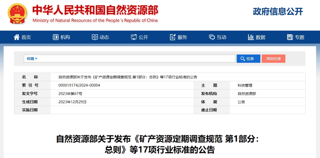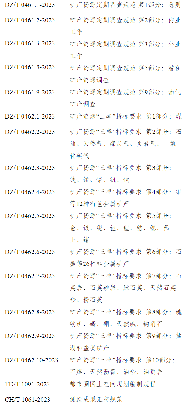 《矿产资源定期调查规范 第1部分:总则》等17项行业标准已通过全国自然资源与国土空间规划标准化技术委员会和全国地理信息标准化技术委员会审查,经2023年第8次部长办公会审议通过,现予批准、发布,自2024年4月1日起实施。标准编号及名称如下:
