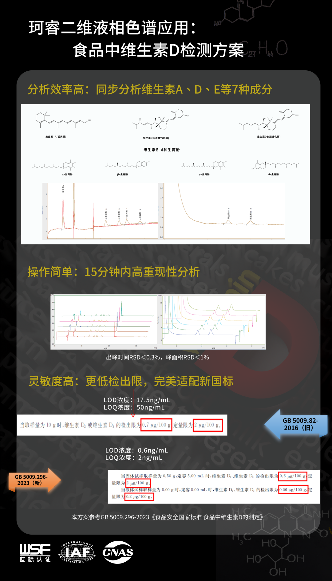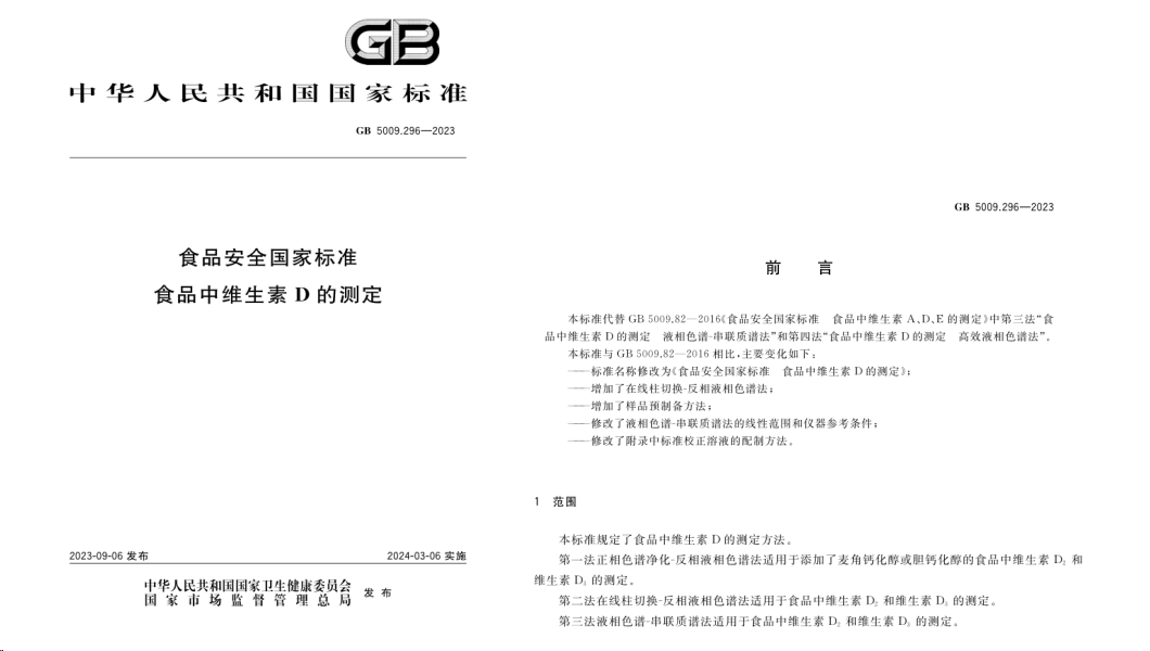 新国标GB 5009. 296-2023《食品安全国家标准 食品中维生素D的测定》将于2024年3月6日正式实施,其中增加了在线柱切换反向液相色谱法,并对食品中维生素D₂和D₃的检出限和定量限做出了调整;