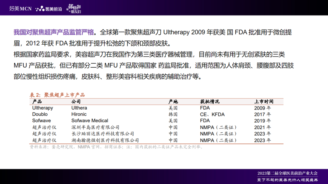 国家药监总局对它的把控非常的严谨。目前在整个行业内还没有一款三类的超声刀获得获批,我们现在叫超声炮的都是二类的治疗仪,可以应用在皮肤和整形美容科。