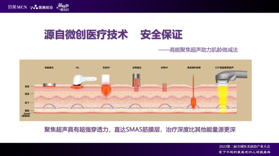 这个是之前跟医美前沿的一场圆桌派当中,北京友谊医院的杨高云主任,他讲对于产品医生最看重超声医疗仪的稳定和均匀的输出,高精准度以及操作的规范性这些是最重要的。包括安全的潮流,特别是在涉及不同深度部位治疗,以避免神经等问题的出现。最后他还讲到,培训和操作的规范性在这个环节中也是至关重要的。