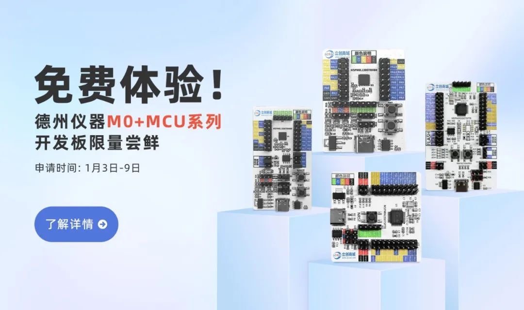 为了立创商城的客户和粉丝能率先尝鲜,便捷体验MSPM0系列性能,立创商城推出德州仪器MSPM0系列开发板供大家免费体验,限量尝鲜!