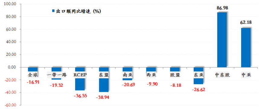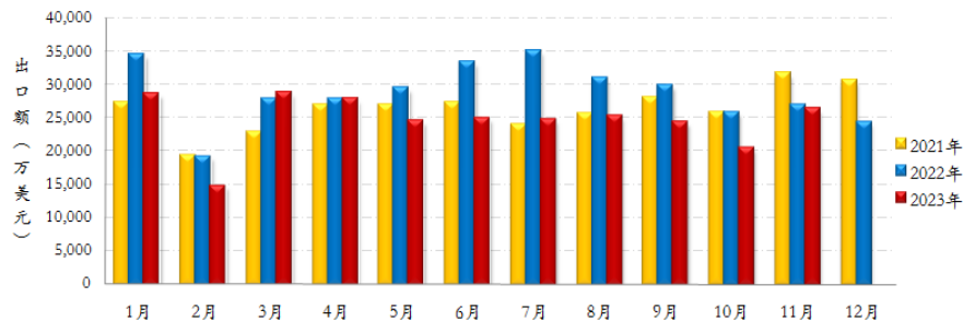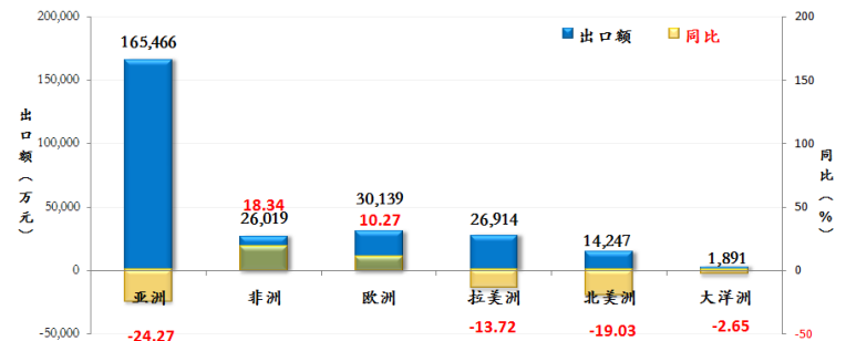2023年1-11月,我国对亚洲、拉美洲、北美洲三大重点市场,以及大洋洲市场出口同比仍呈现下滑态势,仅对非洲、欧洲市场出口同比呈现增长态势。各区域市场中,我国对“一带一路”市场出口额17.2亿美元,同比下降19.32%,占行业出口额比重65.08%,比重较上年同期下降1.95个百分点;对RCEP市场出口额6.63亿美元,同比下降36.55%,占行业出口额比重25.05%,比重较上年同期下降7.76个百分点;对南亚市场出口5.72亿美元,同比下降20.69%;对东盟市场出口5.32亿美元,同比下降38.94%;对西亚市场出口2.67亿美元,同比下降9.90%;对欧盟市场出口1.54万美元,同比下降8.18%;对中亚市场出口1.37亿美元,同比增长62.18%;对东亚市场出口1.15亿美元,同比下降26.62%。
