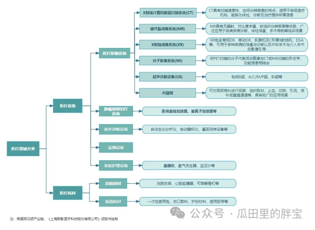 医疗设备按功能又可分为:医疗影像设备、肿瘤放射治疗设备、体外诊断设备、监测设备、家庭护理设备;