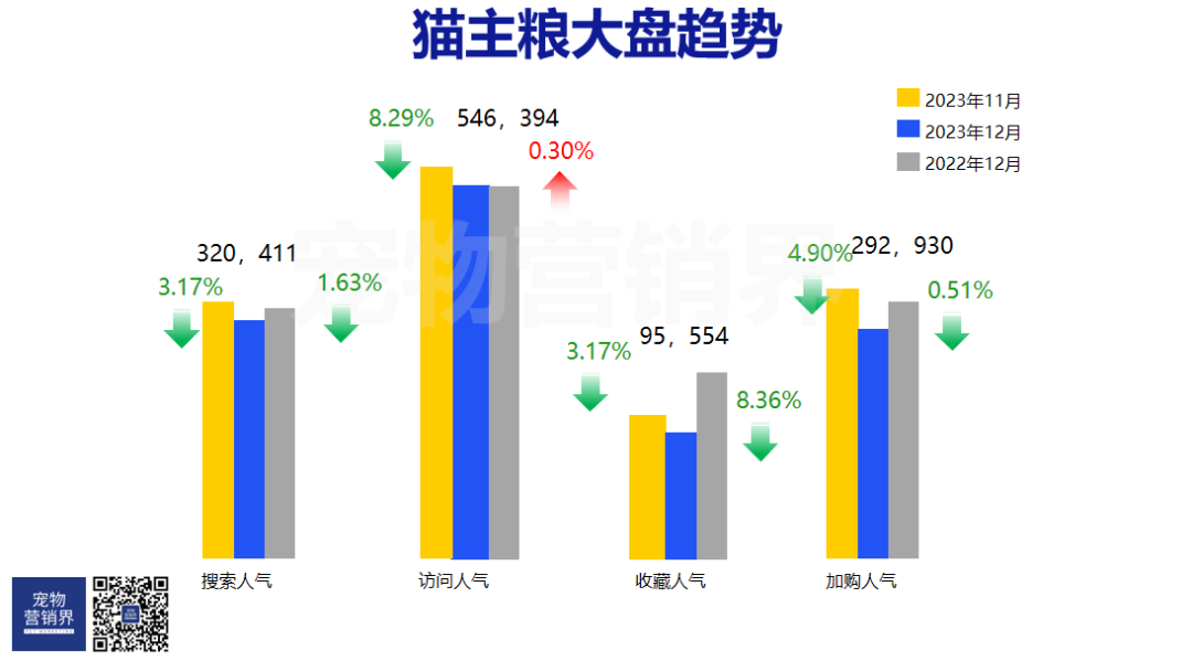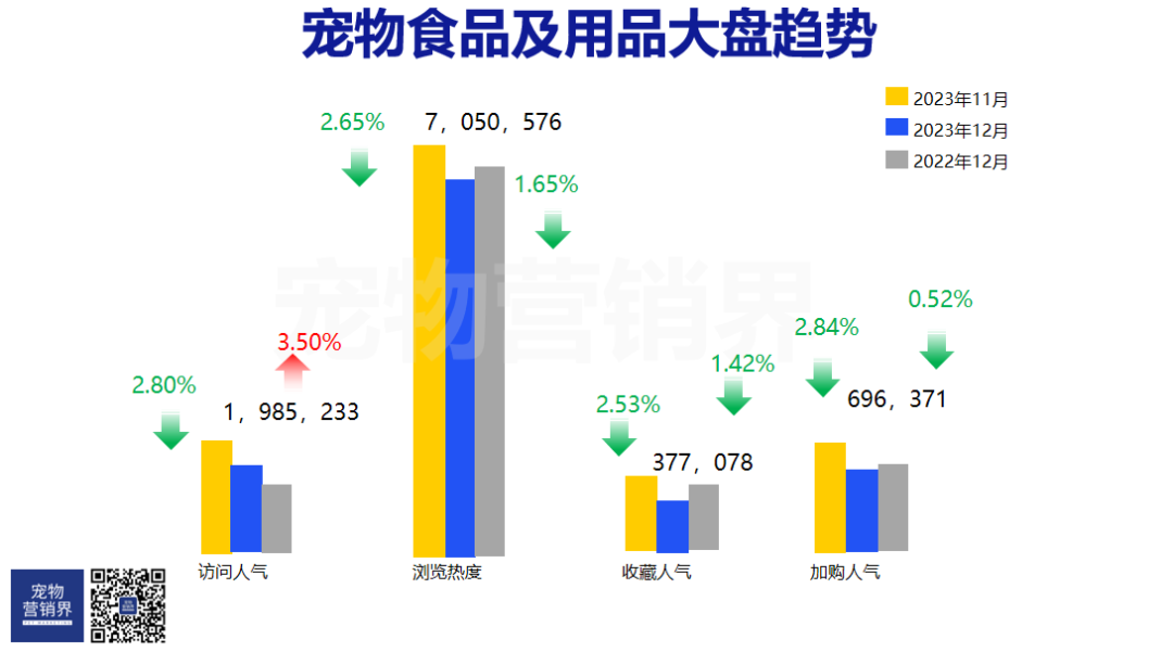 从本次宠物食品及用品大盘中,可看到访问人气同比22年12月呈现增长态势,浏览热度、收藏人气、加购人气同比22年12月均呈现下降态势。