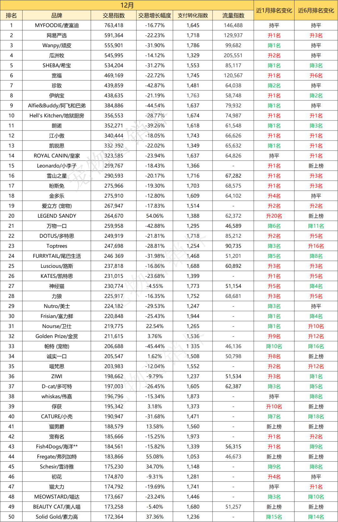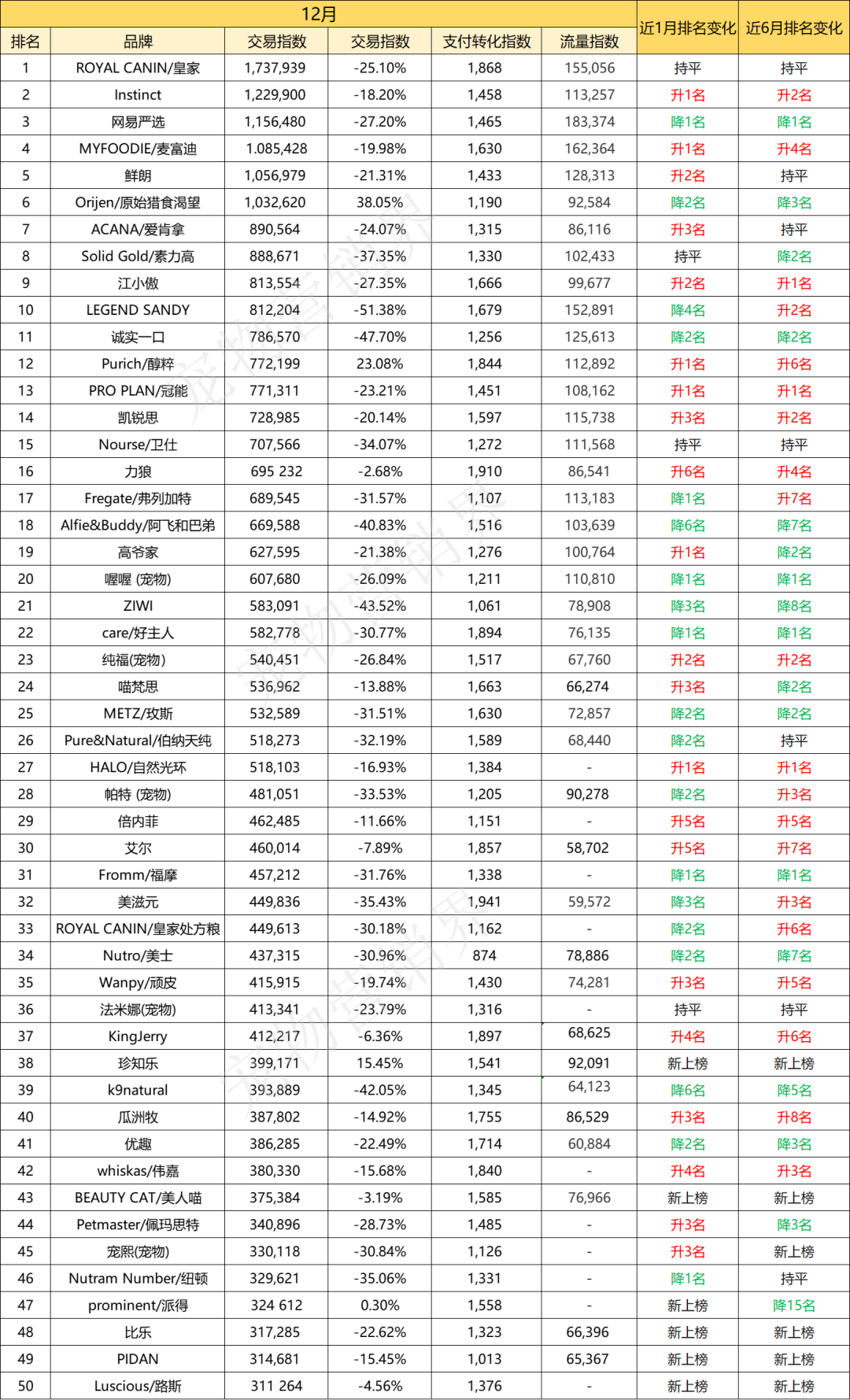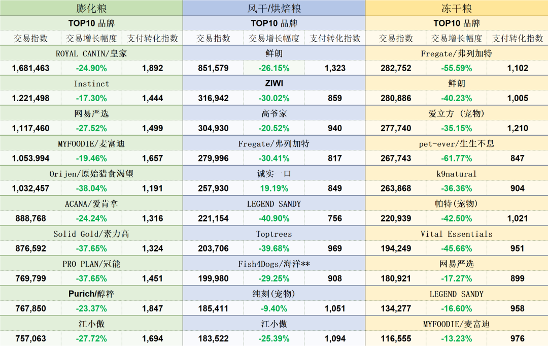 从12月细分市场的高交易品牌看,膨化粮、风干/烘焙粮、冻干粮TOP1品牌分别为:皇家、鲜朗、弗列加特