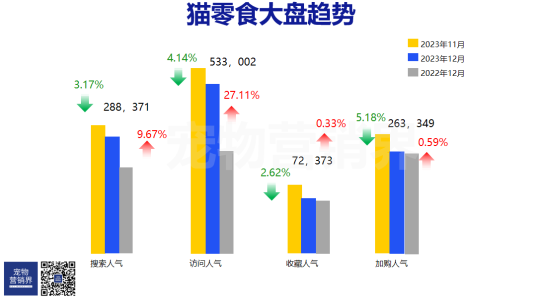 通过细分市场,猫主粮赛道同比22年12月份,除访问人气略高于22年12月份,其余均呈现出下降态势;猫零食赛道同比22年10月,搜索人气、访问人气、收藏人气、加购人气均处于上升态势。