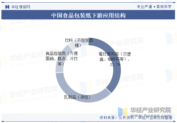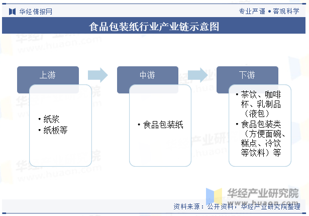 相关报告:华经产业研究院发布的《2023-2029年中国食品包装纸行业市场全景评估及投资前景展望报告》食品包装纸的产业链主要包括上游原材料及设备供应商、中游食品包装制造企业以及下游食品包装纸的应用企业。上游原材料主要包括纸浆及纸板等。食品包装纸主要应用于茶饮、咖啡杯、乳制品(液包)、食品包装类(方便面碗、糕点、冷饮等饮料)等。