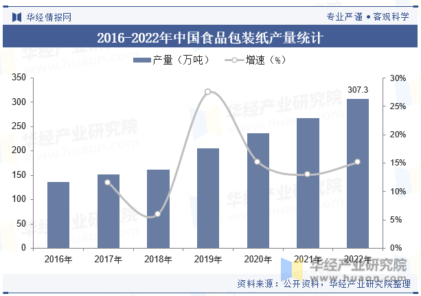 随着国内经济的发展和城镇化水平的提高,食品包装纸行业需求日益旺盛,产销量不断增长。2015年至2022年食品包装纸市场规模从120.6万吨增长至307.3万吨,2015-2022年CAGR为14.30%,行业成长属性明显。