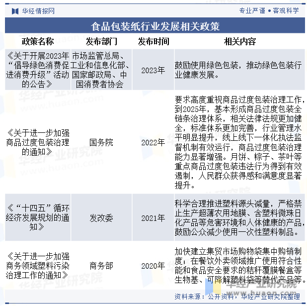 随着消费者对于食品安全和卫生的关注程度不断提高,对于食品包装纸的要求也将越来越高。因此,生产更安全、更卫生、更环保的食品包装纸将成为未来的重要趋势。而随着环保政策的趋严和消费者环保意识的逐渐增强,纸质包装市场将持续扩大。国家对于环保和可持续发展的政策将会越来越严格,这可能会给食品包装纸行业带来更多的机遇和挑战。技术创新也将成为未来食品包装纸行业的重要趋势。新的生产工艺和技术的出现,可能会带来更高效、更节能、更环保的食品包装纸生产方式,从而进一步降低生产成本,提高产品质量。华经情报网隶属于华经产业研究院,专注大中华区产业经济情报及研究,目前主要提供的产品和服务包括传统及新兴行业研究、商业计划书、可行性研究、市场调研、专题报告、定制报告等。涵盖文化体育、物流旅游、健康养老、生物医药、能源化工、装备制造、汽车电子、农林牧渔等领域,还深入研究智慧城市、智慧生活、智慧制造、新能源、新材料、新消费、新金融、人工智能、“互联网+”等新兴领域。