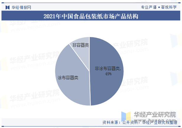 中国食品包装纸行业在总体市场和细分市场方面均具有一定的市场基础和发展潜力。未来,随着环保政策的趋严、消费升级和技术创新的推进,食品包装纸行业将面临更多的机遇和挑战。从食品包装纸的细分市场来看,2021年非涂布容器类食品包装纸占比较高,达49%。