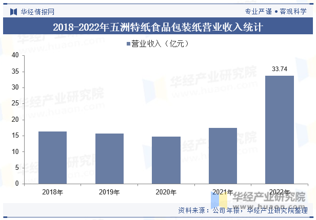 五洲特纸为国内大型特种纸研发和生产企业之一,生产的食品包装纸可分为纸杯纸、面碗纸、餐盒纸等不同种类,主要应用于休闲食品、快消品、餐饮等的包装,也可用于超市零售所需的外包装,具有防水防油、高强度、高松厚度的特点。2022年五洲特纸销售了54.78万吨食品包装纸,实现营业收入33.74亿元,同比增长93.16%。