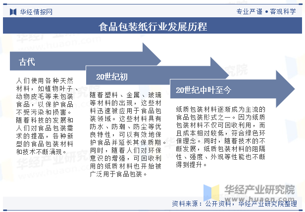 食品包装纸的发展历程是一个不断改进和优化的过程,其发展趋势将不断朝着环保、安全、便捷的方向发展。食品包装纸的发展历程可以追溯到古代。在古代,人们使用各种天然材料,如植物叶子、动物皮毛等来包装食品,以保护食品不受污染和损害。随着科技的发展和人们对食品包装需求的提高,各种新型的食品包装材料和技术不断涌现。