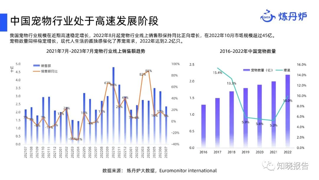 我国宠物行业规模在近期高速稳定增长,2022年8月起宠物行业线上销售额保持同比正向增长,在2022年10月市场规模超过45亿。宠物数量同样稳定增长,现代人生活的孤独感催化了养宠需求,2022年达到2.2亿只。