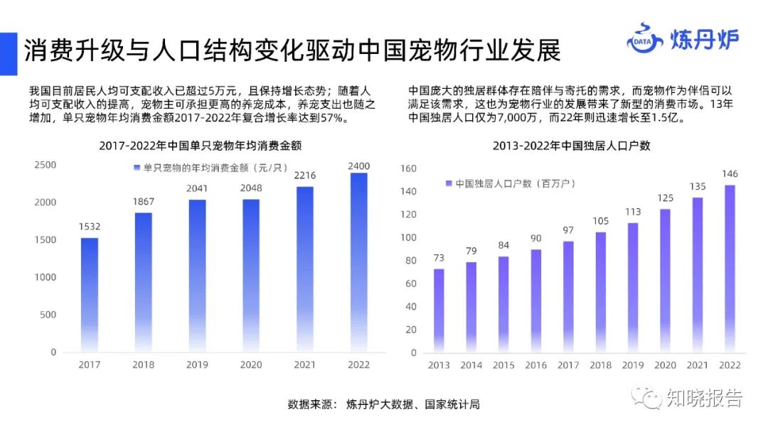 我国目前居民人均可支配收入已超过5万元,且保持增长态势;随着人均可支配收入的提高,宠物主可承担更高的养宠成本,养宠支出也随之增加,单只宠物年均消费金额2017-2022年复合增长率达到57%。