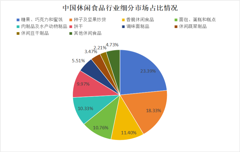 休闲食品包括糖果巧克力和蜜饯、种子及坚果炒货、香脆休闲食品、面包蛋糕和糕点、肉制品及水产动物制品、饼干、调味面制品、休闲蔬菜制品、休闲豆干制品等,种类繁多。从品类结构来看,糖果巧克力和蜜饯类市场占比最大,为23.29%;其次为种子及坚果炒货、香脆休闲食品、面包蛋糕和糕点,占比分别为18.33%、11.40%、10.76%。